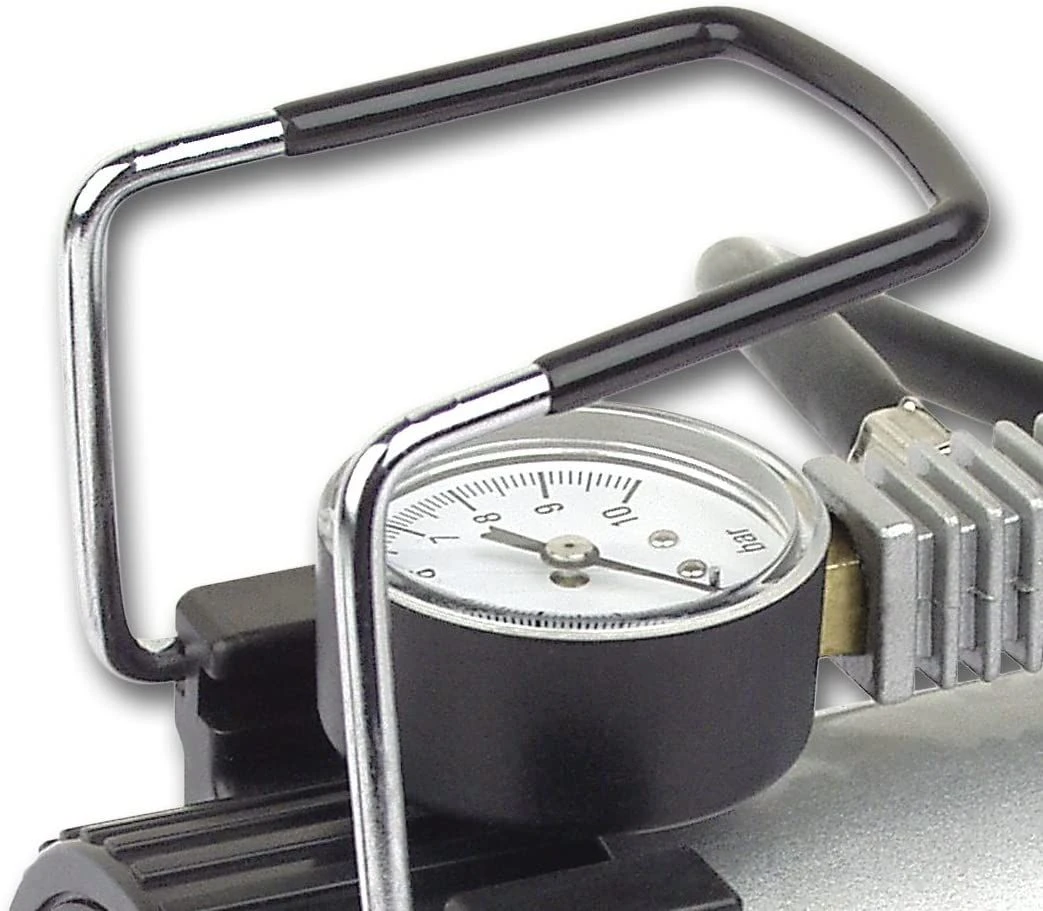 12 Volt compressor in nylon draagtas, geschikt voor het oppompen van de banden van personenauto’s, SUV’s, campers, caravans etc., capaciteit 35 liter per minuut, max. 10 bar / 140 psi. Duidelijk afleesbare manometer, overbelastingsbeveiliging en spatwaterdicht. Lengte luchtslang 1,05 meter, snoer 2,90 meter. Met de 4 meegeleverde ventieladapters ook geschikt voor fietsbanden, ballen, luchtbedden, opblaasbare boten, etc
