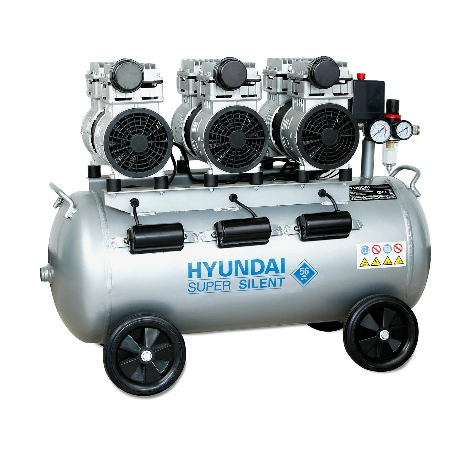 Krachtige 2250 W Hyundai olievrije geluidsarme luchtcompressor ontworpen voor zowel doe-het-zelf- als professionele toepassingen. Deze compressor is ideaal voor het spuiten van verf, wegblazen van vuil en stof, spijkeren, oppompen van banden of het bedienen van luchtgereedschap. De compressor is lichter dan uw conventionele zuigercompressor en hij is volledig olievrij, zodat er geen risico is op olieverontreiniging in de luchttoevoer. De compressor wordt aangedreven door drie 750 W-motoren met een gecombineerd vermogen van 2250 W en maakt gebruik van olievrije membraam-pompen om een schone luchttoevoer te produceren en het geluidsniveau aanzienlijk te verlagen in vergelijking met conventionele zuigercompressoren. Met een tankinhoud van 70 L levert deze compressor een luchtverplaatsing van 360 L/min en een maximumdruk van 8 bar. Het drukregelsysteem stopt en start de motor automatisch om de druk in de luchttank te handhaven en wordt geleverd met een luchtdrukregelaar en manometer.